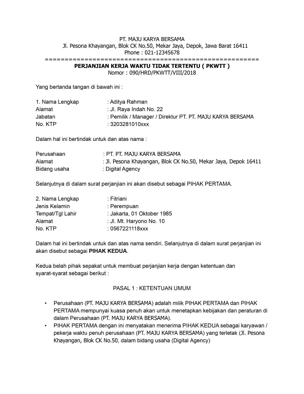 Contoh Perjanjian Kerja Waktu Tidak Tertentu Terlengkap Hukum Line